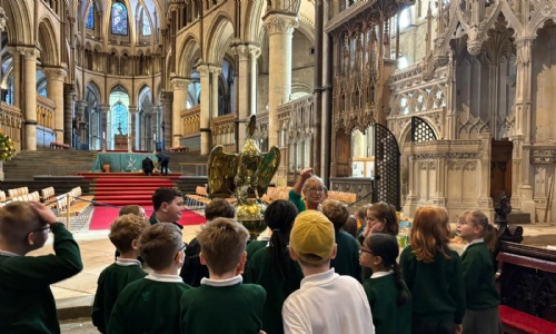 On Monday, our Year 5 pupils enjoyed a fun day out at Canterbury Cathedral. They enjoyed a fascinating guided tour of the cathedral, and explored the beautiful grounds. They also took part in some hands-on workshops, where they had the chance to make their own quills and create a colourful stained-glass window. It was a fantastic experience filled with learning and fun!